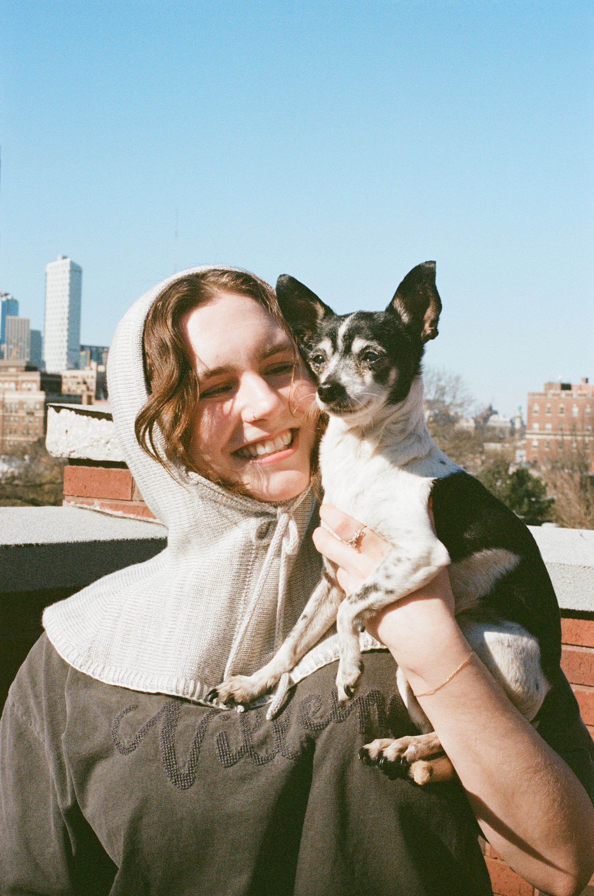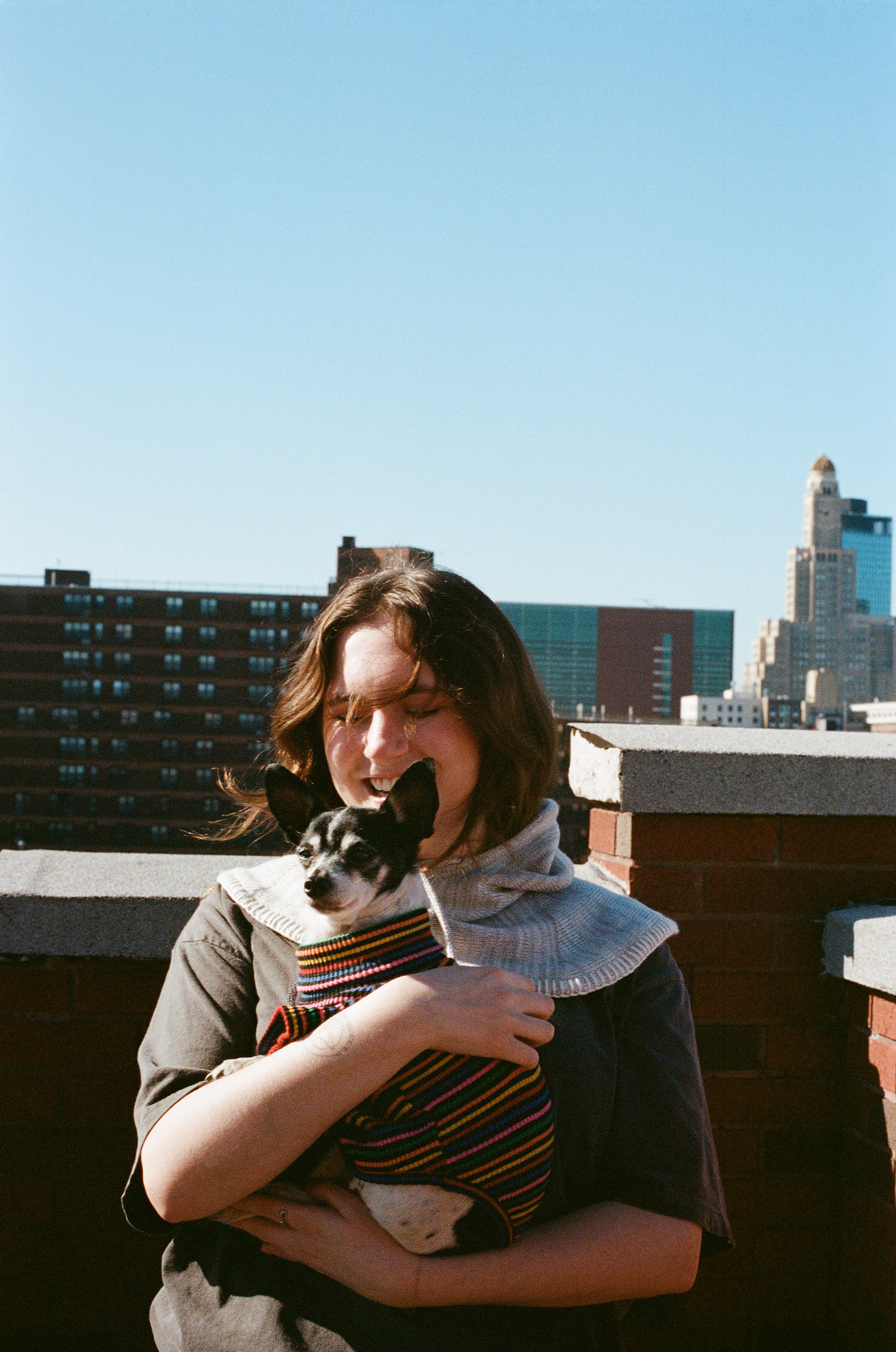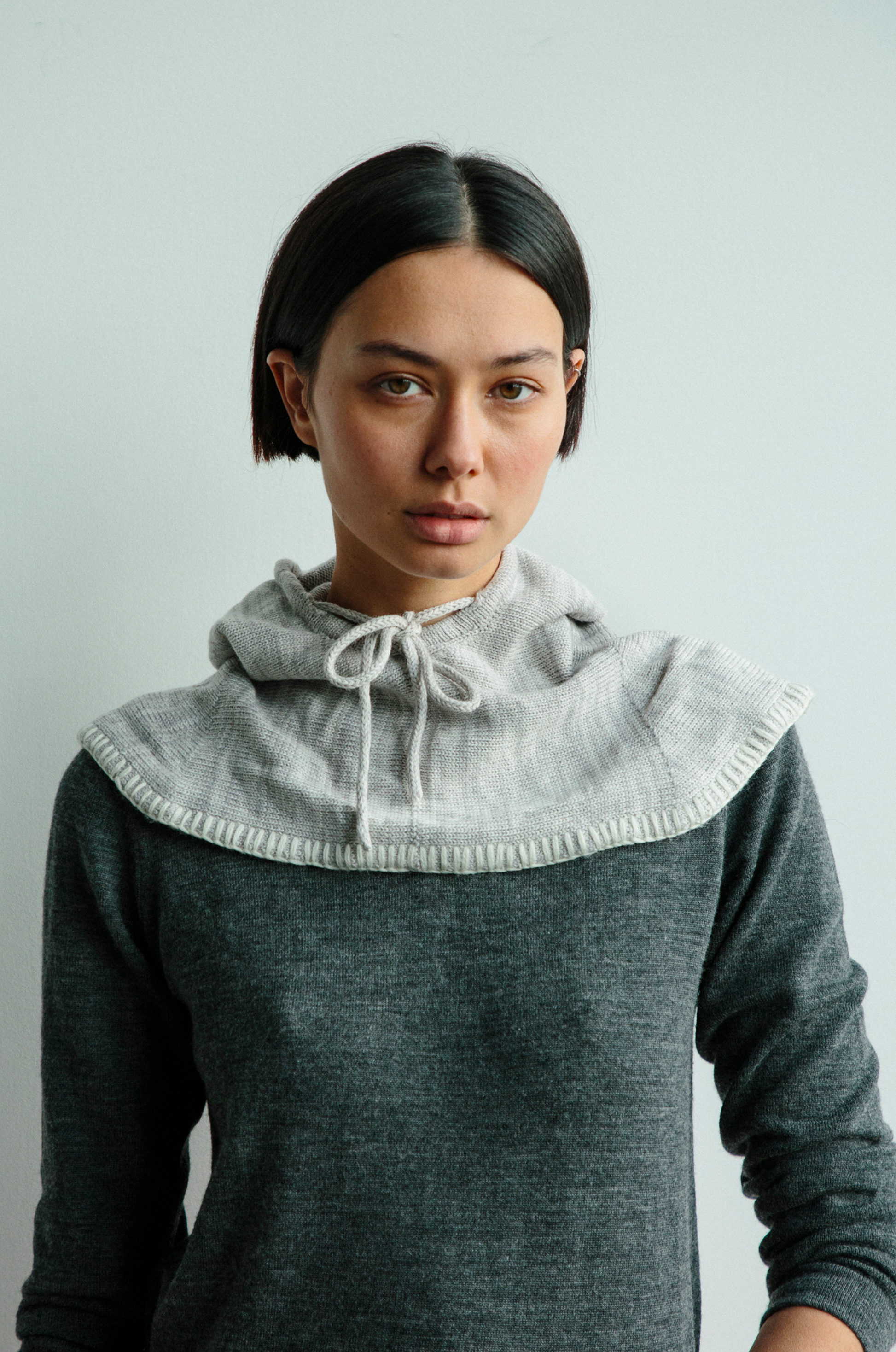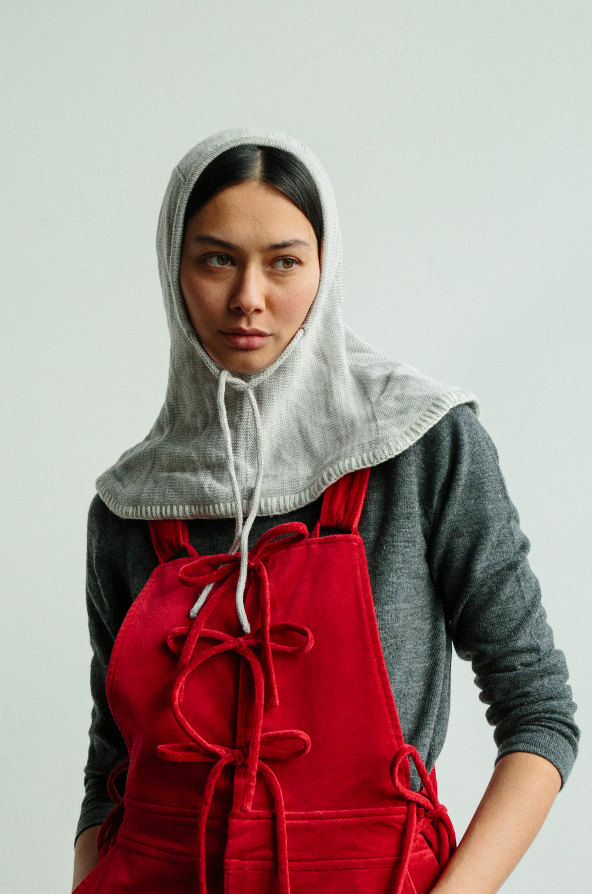 - Contrast blanket stitch edge finish along bib edge in ecru